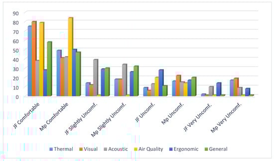 Students from Juiz de Fora and Macapá are comfortable with the air quality (79% and 80%). The students from Juiz de Fora are comfortable with the thermal and visual aspects (75%). Only 49% of the students from Macapá are satisfied with the thermal conditions, because sometimes the air conditioner is too cold or broken. Only 41% of the students from Macapá are satisfied with the lighting in the classroom, since the windows are not enough to let in an adequate amount of daylight, and the lamps are not of sufficient quality and efficiency. The general comfort in the city of Macapá presents a percentage of 47%, and in Juiz de Fora shows a percentage of 58%.