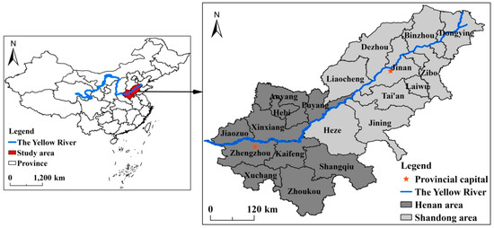 Referring to the existing research results [41], this study defines the lower reaches of the Yellow River as an area of 20 prefecture-level cities in Henan and Shandong provinces (Figure 1), which covers a total land area of 15.119 × 104 km2. This study area combines the areas covered by the irrigation area of the Lower Yellow River based on the close relationship between regional economic development and the lower reaches of the Yellow River as well as the integrity of prefecture-level administrative divisions. As Laiwu was classified as the Laiwu District of Jinan City by approval of the State Council of China in 2019, this study regards it as a prefecture-level city based on the 2017 administrative division. In 2017, the total population of the lower reaches of the Yellow River was 114.278 million, the Gross Domestic Product (GDP) was 6409.996 billion yuan, and the area of urban built-up land was 3093.720 km2, accounting for 8.221%, 7.810%, and 5.609% of China’s total population, GDP, and total area of urban built-up land, respectively. Combined GDP and area of urban built-up land in the cities of Zhengzhou and Jinan was 1634.540 billion yuan and 950.090 km2 respectively, accounting for 25.500% and 30.710% of total GDP and area of urban built-up land in the lower reaches of the Yellow River, respectively. As suggested by these numbers, these two core cities drive urban development and social and economic growth in the lower reaches of the Yellow River.