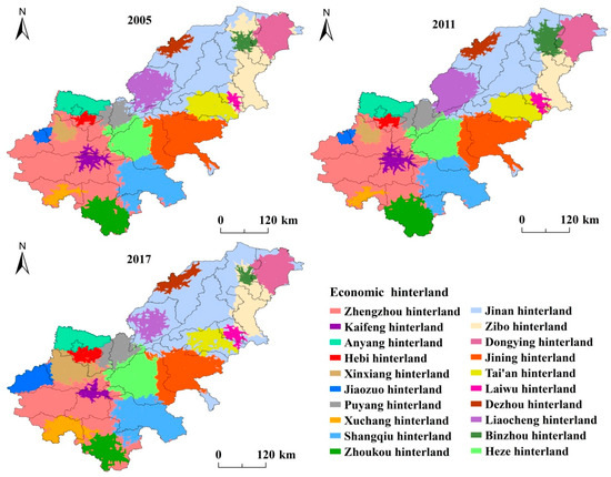 Spatial pattern changes in urban economic hinterland during the period 2005–2017.