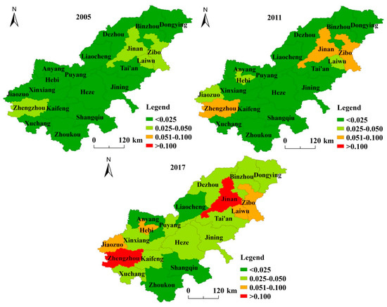 As shown in Figure 3, the geographic concentration of built-up land in the lower reaches of the Yellow River from 2005 to 2017 centers on Zhengzhou and Jinan and spreads to the surrounding areas, gradually forming high-value contiguous zones around Zhengzhou and Jinan. In 2005, the geographic concentration of built-up land in the lower reaches of the Yellow River was generally low. At this time, the spatial distribution of built-up land was relatively balanced. In 2005, the value of built-up land was 0.025–0.050, with the exception of Zhengzhou, Jinan, Zibo, and Laiwu, which were all below 0.025. By 2011, although the geographic concentration of built-up land had increased, the increase was not significant: Zhengzhou, Jinan, and Zibo entered the range of 0.051–0.100, Hebi and Jiaozuo increased from 0.018 to 0.040 and 0.035 respectively, while the rest of the cities remained basically unchanged. By 2017, the imbalance in spatial distribution of built-up land became evident, basically forming a double “core circle” structure with Zhengzhou and Jinan as the core and spreading to the periphery. During the study period, the total area of built-up land in the lower reaches of the Yellow River increased from 1559.080 km2 in 2005 to 3093.720 km2 in 2017, nearly doubling in 12 years, while the total geographic concentration increased from 0.251 to 0.929, increasing by 3.701 times. This further demonstrates that the total amount of built-up land increased while the spatial distribution became more concentrated. During the study period, the total geographic concentration of built-up land in the lower reaches of the Yellow River increased from 0.251 in 2005 to 0.929 in 2017 and increased by 2.701 times in 12 years. The main reason is that most cities in the lower reaches of the Yellow River show multi-center expansion in the process of development. Population and capital around the city tend to concentrate in the urban center with a larger economic total [53]. As a result, the relationship between people and land in the city becomes increasingly tense and land for urban construction begins to increase. From 2005 to 2017, the total area of built-up land in the lower reaches of the Yellow River increased from 1559.080 km2 to 3093.720 km2. The continuous expansion of built-up land area led to the increasing geographic concentration of construction land.