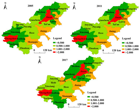 Figure 4 shows that the spatial distribution pattern of urban economic hinterland in the lower reaches of the Yellow River in 2005–2017 changed less than that of built-up land. The economic hinterland was centered on Zhengzhou and Jinan, with a “highest-low-higher” value circle structure, and this pattern gradually weakened in Henan and was slightly strengthened in Shandong. At the three research time nodes (2005, 2011, and 2017), the geographic concentration of Zhengzhou and Jinan was over 2.940 and occupied the highest value area. The low value area was generally near the surrounding cities of Zhengzhou and Jinan, and the changing cities mainly develop from the low value to 0.500–1.000. From 2005 to 2011, the change was small, which demonstrates that Hebi in Henan Province was less affected by radiation from Zhengzhou and that Laiwu in Shandong Province was less affected by radiation from Jinan. The geographic concentration of the economic hinterland of the two cities increased from 0.446 and 0.323 in 2005 to 0.504 and 0.531 in 2011, respectively. By 2017, the values of Xuchang, Jiaozuo, and Xinxiang entered the range of 1.001–2.000, which was an increase from 0.500–1.000 in 2011; as a result, the “highest-low-higher” circle structure of geographic concentration in the economic hinterland of Henan Province was broken. At the same time, Puyang increased from 0.928 in 2011 to 1.096 in 2017, which reflected a one-level increase, and Zhoukou decreased from 0.577 to 0.387, which reflected a one-level decrease. However, Tai’an and Liaocheng dropped from the 0.500–1.000 range to the low value area, which formed a more obvious “highest-low-higher” spatial structure in Shandong Province. Therefore, the equilibrium of the development trend of Henan urban economic hinterland in the lower reaches of the Yellow River in the study period was lower than that of Shandong.