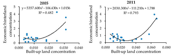 Based on the geographic concentration index of urban built-up land and economic hinterland in the lower reaches of the Yellow River, the fit curve was established by drawing scatter plots (Figure 5). The results show that there was no significant correlation between the geographic concentration of built-up land and economic hinterland in 2005 (the goodness of fit was 0.482). However, with the expansion of urban built-up land, there was a moderate positive correlation in 2011–2017 (the goodness of fit was 0.793 and 0.743), indicating that the spatial agglomeration of built-up land and economic hinterland at the city scale in the lower reaches of the Yellow River had a certain correlation—that is, the larger the area of built-up land, the larger the economic hinterland. However, the degree of correlation was not high, and there were still some cities where the expansion of built-up land did not match the development of their own economic hinterland.