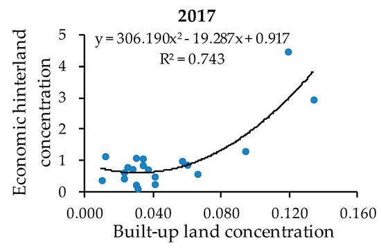 Distribution of urban economic hinterland concentration during the period 2005–2017.