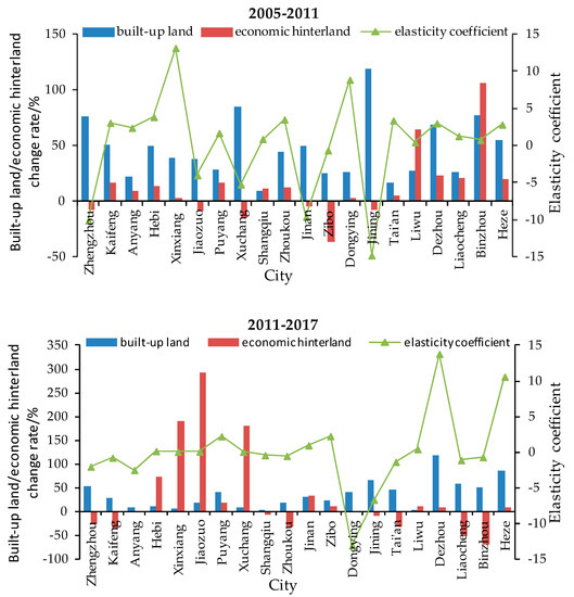 Urban built-up land and economic hinterland change rate and the elasticity coefficient during the period 2005–2017.