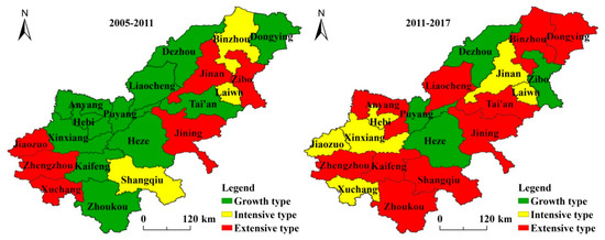 As shown in Figure 7, the coupling model of built-up land and economic hinterland in the lower reaches of the Yellow River from 2005 to 2011 was mainly growth—that is, the built-up land and economic hinterland of most cities were growing rapidly and the elasticity coefficient was greater than 1. Extensive development accounted for 30% of the cities, including Zhengzhou, Xuchang, Jinan, and Jining, while intensive development accounted for 15% of the cities, and consisted of only Shangqiu, Laiwu and Binzhou. Most cities were in growth development (55%), including Kaifeng, Zhoukou, Taian, and Liaocheng. The results reflected a non-intensive development trend in the urban built-up land and economic hinterland in the lower reaches of the Yellow River from 2005 to 2011 and that the growth rate of built-up land was too fast, which was not in harmony with the development of economic hinterland. From 2011 to 2017, the coupling model of urban built-up land and economic hinterland began to develop towards extensive and intensive development. Extensive development accounted for 50% of the cities—Zhengzhou, Kaifeng, Jining, Taian, and 10 other cities—and intensive development accounted for 30% of the cities, including Xuchang, Jiaozuo, Jinan, and Laiwu, and six other cities. Only four cities—Puyang, Zibo, Dezhou, and Heze—were considered growth development, which accounted for 20% of the cities. By comparing the changes in the coupling relationship between urban built-up land and economic hinterland development in the two periods of 2005–2011 and 2011–2017, the development process of an economic society and new urbanization in the lower reaches of the Yellow River have a strong trend, but the overall urban built-up land expansion appears too fast.