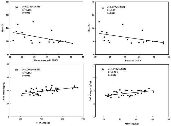 No significant correlations were found between the concentrations of nutrients in plants and soils (RS and BS) (P > 0.05) (Table S1). However, the concentration of shoot N was significantly negatively correlated with MBN in RS and BS under the different levels of grazing intensity (Table S1). The regressions between shoot N and MBN in RS and BS also identified significant negative relations (Figure 5a,b). MBC was significantly positively correlated with soil C, and MBN was significantly positively correlated with soil N (Figure 5c,d and Table S2).