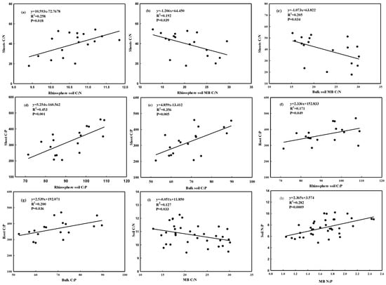 Regressions (y = ax + b, R2 = coefficient of determination) between stoichiometric characteristics in the plant–soil–microbe system. (a) Shoot C:N and rhizosphere soil C:N; (b) shoot C:N and rhizosphere soil microbial biomass C:N(MB C:N); (c) shoot C:N and bulk soil microbial biomass C:N(MB C:N); (d) shoot C:P and rhizosphere soil C:P; (e) shoot C:P and bulk soil C:P; (f) root C:P and rhizosphere soil C:P; (g) root C:P and bulk soil C:P; (i) soil C:N and microbial biomass C:N(MB C:N); (h) soil N:P and microbial biomass N:P(MB N:P). Regressions are significant at P ≤ 0.05.