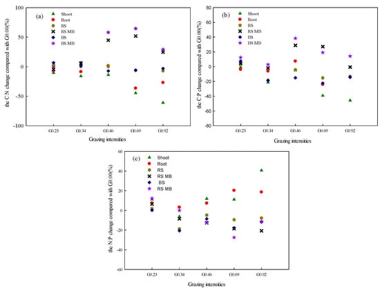 Trend chart of the stoichiometric changes (%) in (a) C:N ratio, (b) C:P ratio, and (c) N:P ratio at each level of grazing intensity (G0.23, G0.34, G0.46, G0.69, and G0.92 AU ha−1) relative to the no grazing treatment (G0.00) in plants (shoots and roots), soil (RS, rhizosphere; BS, bulk soil), and soil microbial biomass (MB).