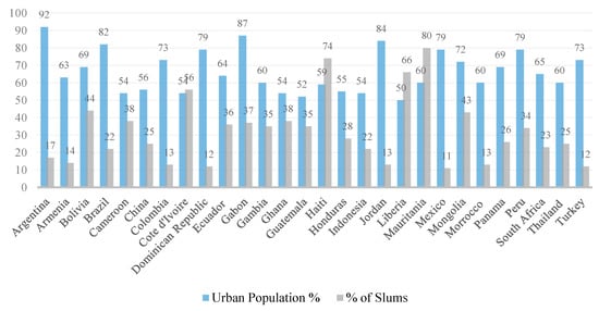 Different from climate change, the slums have been considered important urban issues for a long time. These settlements were part of the history of industrialized nations, as they dealt with urbanization and inequality [6,7]. Today, however, urban informality is a major territorial phenomenon mostly affecting the developing world. According to the World Bank [8], around 30% of the urban population in developing countries lives in slums. The proportion of urban population living in informal settlements is highest in Sub-Saharan Africa (55.2%), followed by South Asia (30.5%), East Asia and Pacific (25.8%), and Latin America and the Caribbean (20.5%) [8]. In total, around one billion people, or around 13% of the global population, live in slums, and this number is expected to increase in the following years [4,9], thus, these settlements are significant populations to be studied in climate change policies.