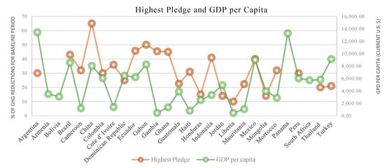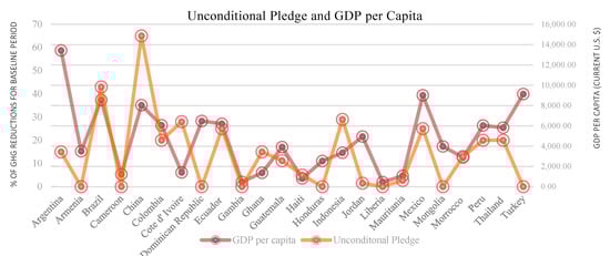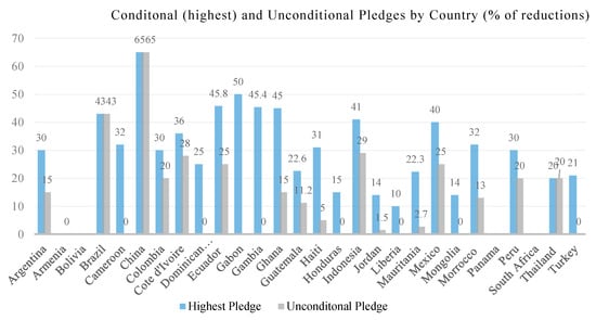 Figure 3 also exposes how many of the analyzed countries (12 out of 28) did not propose unconditional pledges in their NDCs (Armenia, Bolivia, Cameroon, Dominican Republic, Gabon, Gambia, Honduras, Liberia, Mongolia, Panama, South Africa, and Turkey). This supports the idea that many developing countries are still reluctant to commit to reducing GHG emissions, because these reductions can limit economic prosperity. One of the so-called “victories” of the Paris Agreement was eliminating Annex I and non-Annex I subdivisions and getting contributions from all countries. However, most of the contributions by developing countries are subject to conditions, as the analysis revealed, and at the same time, they are not sufficient to achieve the agreement [20,21]. In a way, the wounds of Annex I and non-Annex I countries from the Kyoto Protocol are still present in the Paris Agreement. This suggests that the UNFCCC must identify novel ways to involve developing countries in unconditional reduction programs in order for the emergent climate regime to be successful [51,52,53].