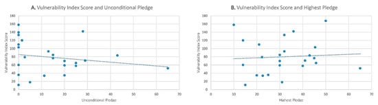 Furthermore, the analysis shows that there is a weak correlation between unconditional pledges and the countries’ vulnerability index score (VIS) (R = 0.19), and between highest pledge and VIS (R = 0.06) (Figure 6). The vulnerability index is a score developed by Germanwatch [64] that measures the overall vulnerability of a country to climate change: the lower the score a country receives the higher its vulnerability. The results of this analysis imply that for the selected countries there seems to be more important or pressing issues than reducing emissions, even if these countries are considered some of the most vulnerable to climate change events. This finding goes in line with the recent My World survey by the United Nations, which found that for lower income and low-development countries, climate change actions are not a priority. The survey asked participants to rank the most pressing issues in their countries. The issues presented ranged from education, health, income, and others, and out of these, climate change action was placed last out of 16 places of important priorities [71].