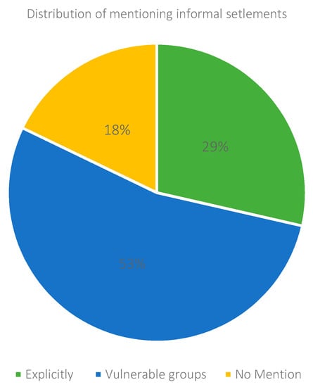 To answer the main question of this article, while reviewing the NDCs, special attention was paid to finding, highlighting, extracting, and coding strategies or goals, mentioning keywords or phrases representing informal settlements. These keywords could be: informal, marginalized, urban poor, unplanned, unregistered (areas, communities, zones, or settlements), slums, urban informality, barrios, comunas, favelas, campamentos, shantytowns, shack, or any other concept that infers the United Nations’ definition of informal settlements [4]; this represented an explicit or implicit use of the term. Only eight out of the 28 analyzed countries mentioned specific strategies involving communities living in urban informality. Additionally, 15 of them mentioned strategies for “vulnerable” groups, but these cannot be counted as strategies specifically for slums because in many cases “vulnerable” in an NDC refers to other groups, such as indigenous communities, women, children, people with disabilities, or others. Five countries did not mention, explicitly or implicitly, any strategies aimed at informal settlements or vulnerable groups (Figure 7).