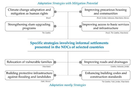 In regards to adaptation strategies, these are key components in the NDCs of developing countries and are critical to combat climate change, especially in informal urban poor settlements [1,3,59]. While the main goal of an NDC is to show the mitigation pledges a country proposes to limit emissions of greenhouse gases, the UNFCCC encouraged countries to include adaptation sections in their NDCs. Article 7 of The Agreement states that parties should establish goals in adaptation as a way of “enhancing adaptive capacity, strengthening resilience and reducing vulnerabilities to climate change”. The Agreement also states that adaptation should be undertaken, taking into consideration vulnerable groups and ecosystems.