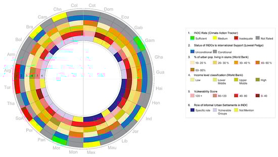 NDCs of the 28 countries case studies. Comparative analysis of rate by Climate Action Tracker (CAT), pledge, slums percentage, income level, vulnerability, and role of informal settlements in contribution. Note: countries’ names are abbreviated in the outer part of the circle.
