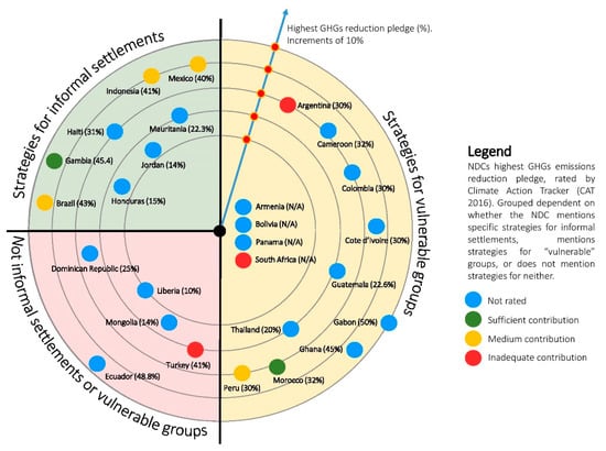 The language of the NDCs is complex and the relationships between different concepts and variables should not be taken as causal, but they are nevertheless suggestive [58]. The results described in Section 4.1 and Section 4.2 create a picture where the proposed pledges, income level, and vulnerability to climate change among the selected developing countries are not correlated. In other words, those with higher income or considered “more vulnerable” do not necessarily have higher pledges. Furthermore, when combined with the findings in Section 4.3, the indicators from Section 4.1 and Section 4.2 are not determining factors in including specific climate policies for informal settlements. These findings are aggregated visually in the next two figures.