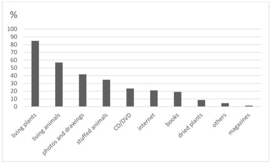 Despite living animals and plants, teaching and learning materials have included for example stuffed animals, dried plants, plastic models, identification books with photos or drawings, dichotomous identification keys, signs and tracks of animals, videos and animations [,]. Additionally, identification of species has included the use of the Internet [], Internet-based taxonomic resources [] or web-based key characteristics of species []. According to Randler [], there is a positive relationship between different kinds of animal-related activities and species knowledge. People who used identification books also had significantly higher scores in knowledge than other participants. The Internet, on the contrary, was not considered an optimal source for identification of unfamiliar species in Randler’s study [].