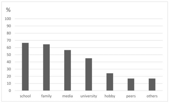 When the student teachers were asked to tick their 1–3 most important sources for information of species out of the seven alternatives, more than half of them ticked ‘school’ (66.5%), ‘media’ (64.4%) and ‘family’ (56.5%), while ‘university’ was ranked by 45.1% of them (see Figure 3). About a quarter of them (24.2%) had ‘hobbies’ as a source, connected to plant and animal consciousness. Several student teachers considered obtaining information also from their friends (16.9%) and other sources (16.9%). The category ‘others’ included mostly books and films of different kinds.