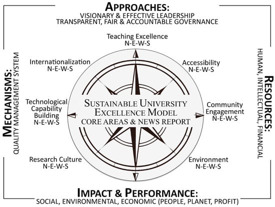 Figure 1 provides one possible SUEM expression. A compass resides at the heart of Figure 1. The logic behind this is that each of the seven core elements included in the SUEM must be assessed, with preference for usable simple assessment over assessment that is unnecessarily complex. This latter observation is a critical motivation of so-called “springboard” models and assessment methods—ones that are relatively simple as a means of “springing” users of such models and methods toward relevant objectives—in this case, progress toward sustainable university excellence. In this spirit, assessment of institutional progress and performance relative to each of the seven core areas is examined through four simply expressed lens, symbolized by N, E, W and S [127]. Lenses for each core area are cited in Table 1, with those described in the table being initial “strawmen” and hence subject to refinement or substitution as this methodology evolves.