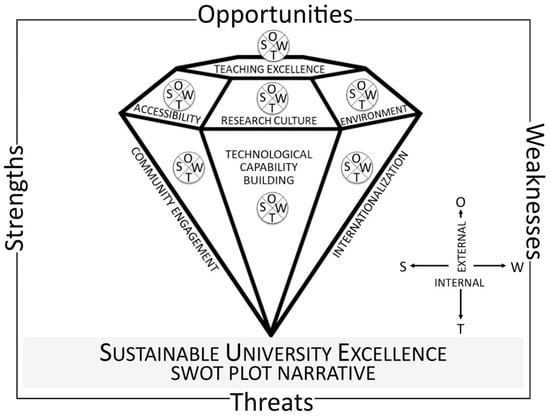 The notion of sustainable development has dominated organizational and environmental excellence research over the period of the last decade. This is expected to continue in future due to its relevance to global concerns [1]. It is unreasonable to expect sustainable businesses, operations, and services without a knowledgeable, skilled, and competent workforce along with other essential components. Such outcomes are “end of the pipe” in that they are results, the manifestation of which most typically flow from relevant core values that have been baked into equally relevant strategy and subsequently deployed via appropriate policies, practices, processes, and partnerships. Universities are hubs for providing a knowledgeable, skilled, and competent workforce, along with informed citizens. Therefore, university sustainability is an essential characteristic for the sustainable development of all allied stakeholders: Businesses, operations, and society. Substantial research efforts have documented the positive impact of higher education on socioeconomic development (SD) [2,3,4,5]. Universities play critical roles in promoting awareness, creating and developing skills, and producing SD knowledge; however, sustainability of universities themselves has been heretofore inadequately addressed, especially within the domains of organizational governance and strategic perspectives [6,7].