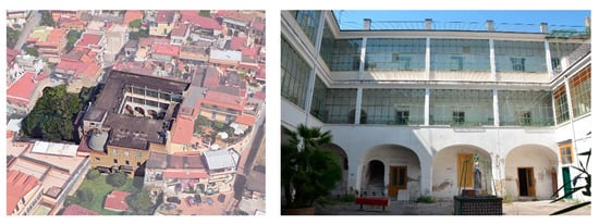 The monastery was built as an orphanage for girls in 1818 [45,46], far from the city center of that time. The growth of the congregation led to incremental construction: In 1860, the ground floor was completed, and the Church of Santa Maria del Carmine was built as an annex to it. In 1937, the original order left the building, which was acquired by a new congregation who enlarged the monastery building with two other floors and established a private elementary school. The order left the monastery in 2003 after many years of intense activity. The municipality acquired the monastery in 2010, even though it has been unused since 2003.