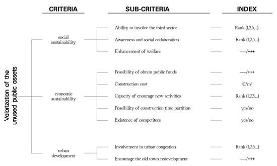 In the first stage of the decision-making process, the decision maker (DM) identifies problems, opportunities, and objectives regarding the reuse project of the heritage building. To accomplish this, a list of criteria was identified. The list of criteria was structured based on appropriate reference [26], which identified the main categories of analysis, but considering the peculiarity of the case study, this also emerged in a focus group with the public administration and the technicians.