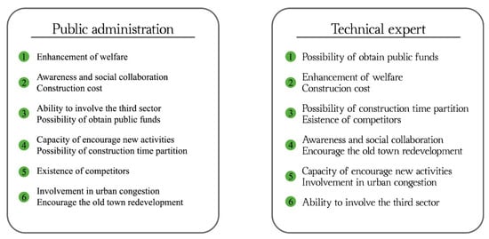 As Figure 3 illustrates, the criteria identified are more oriented toward social issues and the integration of the building in the urban context. Currently, the main strategic objective of the public administration is to create a new catalyst for the entire urban development process.