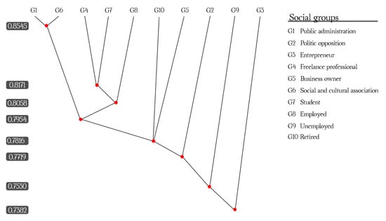 The social evaluation was developed with the aim of understanding the possible coalition generated by the choice of the best alternative [32,33]. This analysis was carried out with the help of the Novel Approach to Imprecise Assessment and Decision Environments (NAIADE) method [34]. The NAIADE method captures the preference of stakeholders and supplies indications of the distance of positions among the different interest groups. It evaluates the social compromise solution through the analysis of the possible coalitions. The NAIADE method is a discrete social multicriteria method, which includes mixed types of information and a conflict analysis in a fuzzy environment. Through pairwise linguistic evaluation, “based on semantic distance between linguistic qualities”, two types of evaluation are provided. The first regards the assessment of the alternatives based on the social impact matrix, which contains a qualitative evaluation of each alternative with respect to a defined set of criteria, based on the stakeholder’s preferences. The second analysis is performed by the completion of an equity matrix, where a similarity matrix is calculated. It sheds light upon the level of decision conflicts among the different interest groups and highlights the possible formation of coalitions (building a dendrogram of coalitions), showing the impact of each alternative as perceived by the social actors. In this way, NAIADE provides the following information: (a) distance indicators between the interests of the different social actor groups, as an indication of coalition formation possibility or interest convergence; (b) rankings of alternatives for every coalition, in accordance with the impacts on the social groups or the social compromise solution.