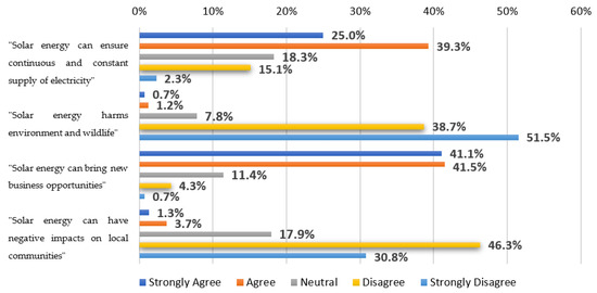The respondents were asked to assess four general statements based on a 5-point Likert scale. A total of 64.3% participants agree (or strongly agree) with the statement “Solar energy can ensure a continuous and constant supply of electricity,” while 17.4%) disagree and 18.3% have a neutral attitude. While the responses to the statement “Solar energy harms environment and wildlife” were more one-sided with 90.2% not agreeing with the statement, only 7.8% of the respondents choose a neutral opinion. Moreover, the vast majority (82.6%) agree with the statement “Solar energy can bring new business opportunities”. On the other hand, 5% disagree and 11.4% have an indifferent position. Furthermore, rejection of the statement “Solar energy can have negative impacts on local communities” predominates (77.1%), while a neutral stance of 17.9% and a significant low agreement rate of 5% was observed (see Figure 1).