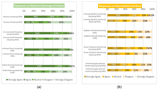 Concerning the relative advantage attribute, most of the acceptors agree on the positive effects of all variables of the relative advantage. The unlimited power variable, which refers to the inexhaustibility of solar energy for the generation of electricity, had the highest rates of respondents who agree on its positive effects. On the other hand, respondents who reject RSPS installation had higher disagree rates on the revenue component of solar energy, as shown in Figure 2a and Table 4.