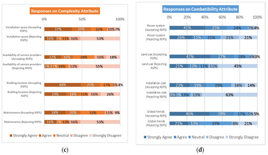 The analysis of the complexity attribute revealed a general trend that RSPS acceptors agree on the positive effects of all complexity variables except for the availability of service providers. The highest agree rate of these variables was for the residence location. On the other hand, respondents who rejected RSPSs installation show several trends in disagreeing on the positive effects of installation space, availability of service providers (which had the highest disagree rate), and maintenance (Figure 2c and Table 4).