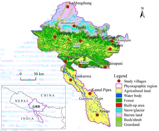 Location of the Gandaki River Basin (GRB) and selected villages in the different physiographic regions. Land cover data source: [28].