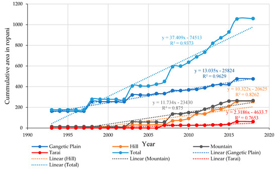 Farmland abandonment activities have been reported since 1958 in the GP region of the GRB. According to the local farmers, farmland abandonment has been increasing rapidly in recent years. Figure 2 shows the cumulative area of abandoned farmland since 1993. The trend lines indicate annual increases in the area of farmland abandonment of 37 ropani (1 ropani = 5476 square feet) in the GRB, 13 ropani in the GP region of India, 2 ropani in the Tarai region, Nepal, 10 ropani in the Hill region of the GRB, and 12 ropani in the Mountain region of the GRB since 1993 (Figure 2).