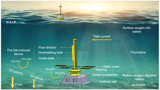 where A and H are the area and thickness of the hypoxic zone, respectively, and is the lack of dissolved oxygen per unit volume. For the proposed downwelling device with an equivalent diameter of 0.8 m and a height of 6 m, it is estimated from Equation (17) that 40 devices can generate a downwelling volumetric flux at 3.7 m3/s in the case of a current speed of 0.2 m/s. Combined with the difference of 4 mg/L of dissolved oxygen mentioned above, the resulting downward oxygen flux is 14.8 g/s or 53.28 kg/h. Here, we assume for simplicity that tidal current works effectively 2 h per day. Therefore, at least 75 days are needed prior to the occurrence of hypoxia when tide-induced downwelling devices are placed.