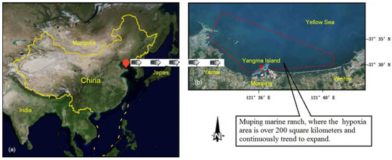 The Muping marine ranch is located in the eastern end of the Shandong Peninsula, which is one of the most important mariculture regions in China (Figure 2). Many potential impacts of hypoxia on the sustainability of fishing and the economy in the Shandong Peninsula, China, have been reported. The marine ranch may be typical of severely stressed ecosystems there is currently burdened with severe seasonal hypoxia. Occurring in the bottom waters of the Muping marine ranch, hypoxia is associated with the high density of aquaculture and pollution and with the serious land-based pollution in summer. The ecosystems in the marine ranch have experienced drastic reductions in bottom fisheries due to hypoxia. Since the 2000s, increasing hypoxia has been blamed for the high mortality of the highly valued sea cucumber and huge economic losses [15].
