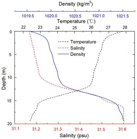 Measured vertical distribution of temperature and density in the Muping marine ranch on 21 August 2016.