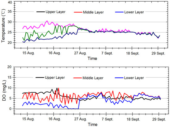 Time series of the observed oxygen concentrations and temperatures at three different depths (the upper layer, middle layer, and lower layer) in summer 2016.