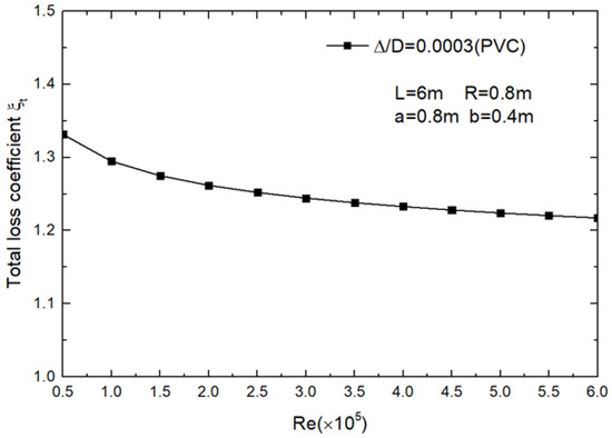 where is the total loss coefficient associated with the Reynolds number and tube geometry. Assuming that the material of the vertical tube is PVC, the relative roughness of the inner wall of the vertical tube is 0.0003. The relationship between Reynolds number and total loss coefficient is shown in Figure 5. As the Reynolds number increases, the dynamic viscosity decreases, which means that the viscous force is weakened, thereby mitigating the degree of reduction of the loss coefficient. Therefore, when the Reynolds number increases by 12 times, the overall loss coefficient only reduces by 8.5% due to the weakening of the viscosity force.