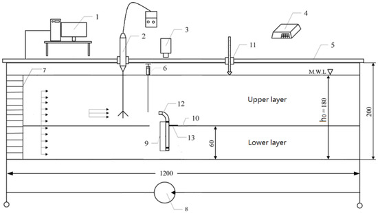Schematic diagram of the circulating flume facility used in this experiment, all dimensions are in cm. (1. Data acquisition system, 2. Velocimeter, 3. High-speed camera, 4. Electronic scale, 5. Water flume, 6. Tracer injector, 7. A set of honeycomb tubes, 8. Adjustable flow pump, 9. Deflector, 10. Partition, 11. Water level gauge, 12. Tidal tube, 13. Flange plate).