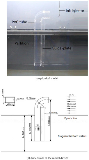 In order to investigate the performance of the novel tide-induced device for artificial downwelling, scale model experiments were carried out in a two-layer stratified flume, 12 m long, 0.6 m wide and 1.8 m deep, at the Hydraulics Laboratory at Zhejiang University, China. Figure 6 is a schematic diagram of the experimental setup. As shown in the schematic, the experimental apparatus consists of the flume, a downwelling device, different kinds of measuring facilities, and other auxiliary facilities. The flume is capable of generating constant horizontal currents for different velocities by changing the inlet water flow rate and the opening degree of the outlet water valve. The upper layer and lower layer of the flume are separated with a stainless steel plate, each layer is equipped with a flow pump driven by an electrical motor with a maximum flow rate of 1300 m3/h. The horizontal current velocity of the simulated tidal current generated by the flow pump ranges from 0.01 m/s to 1.0 m/s. Due to the vibration characteristics of the pump, it is necessary to install a set of honeycomb tubes with a height exceeding the water level to suppress fluctuation and smooth turbulence of the inflow water. The two-layer model of the flume simulates the basic features of natural stratification. The model of the downwelling device is scaled according to Froude’s Law on a scale ratio of 1:10. It consists of three main parts, which are made of transparent PVC plates: (i) a vertical square tube, (ii) a 90° bend sitting on top of the tube, and (iii) two symmetrical-guide plates, which are installed alongside the vertical tube (Figure 7).