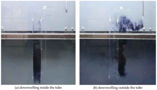 Images are captured of the ink head just reaching the exit of the bend and the lower end of the tube. The time interval between the two images is obtained by video processing software, and the distance from the bend outlet to the lower end of the tube is measured, so the downwelling flow rate is finally obtained. In order to reduce the experimental error, four experiments were conducted to obtain the average value. The descending process of ink in the tube is shown in Figure 8a. The needle is moved down and the ink is released about 15 cm in front of the guide plate. Figure 8b shows the downwelling outside the tube, which indicates the effectiveness of downwelling induced by the guide-plates. The guide-plates symmetrically installed on the front wall of the tube may also induce downward flow. The horizontal current decelerates because of the blocking effect. According to Bernoulli principle, this deceleration increases static pressure at the guide-plates and the tube which, if large enough to overcome stratification, will drive downwelling flow outside the tube. The experimental results show that this will approximately double the downwelling flow rate of the device. Further work will focus on the optimal designs of the guide-plates which will make further efforts to increase the downwelling flow rate of the device.
