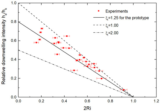 Here, and are the downwelling kinetic head and horizontal current kinetic head, respectively, is the total loss coefficient, near a constant value of 1.25, as read from Figure 5. The validation of the theoretical model can be verified by comparing the experiments with theoretical results. Figure 9 suggests that the experimental results are basically consistent with the theory, confirming the validation of the physical model in predicting the current-induced downwelling flow. As Ri increases, the effect of stratification becomes more obvious, and the intensity of the downwelling flow decreases proportionally (Figure 10). The downwelling flow disappears once Ri is greater than 0.5.