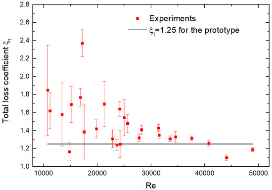 The influence of the scale effect on the experimental results may be properly illustrated by the results for the total loss coefficient and Reynolds number shown in Figure 10. The experimental results in Figure 10 show that with the increase in the Reynolds number, the total loss coefficient still has an obvious decreasing trend, and in most case, the Reynolds number is larger than the assumed constant coefficient in the prototype, indicating the positive deviation between the experimental results and the theory. It is then plausible to have positive deviations between the experimental and theoretical results.