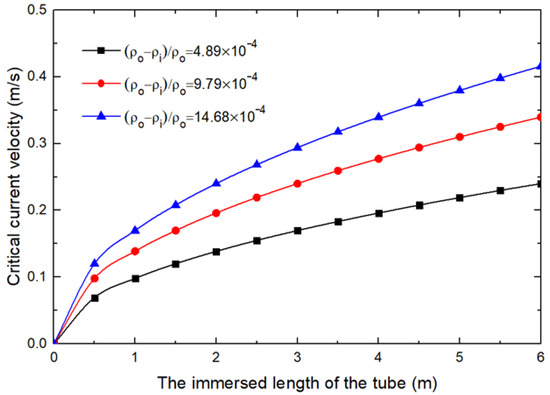 To ensure the downwelling flow in the tube, we introduce the concept of critical current velocity, which can also be called minimum horizontal velocity. It is the minimum horizontal current velocity, which overcomes the stratification resistance and generates downwelling flow, with the variation of the density difference of surrounding water and the length of the tube immersed below the pycnocline. The immersed length of the tube below the pycnocline is an adjustable engineering parameter that is not determined by the environment. With an invariable density difference, the immersed length of the tube mainly affects the critical current velocity. The critical current velocity to generate downwelling flow can be expressed as the following equation, which originates from Equation (1).