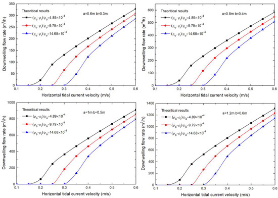 To better understand the performance of the tidal tube, the downwelling flow rate is discussed in the next few sections with respect to the horizontal current velocity, relative density difference, immersed length, and tube geometrical dimensions. With this in mind, Equation (16) can be rewritten as the following equation to better understand the downwelling flow rate.