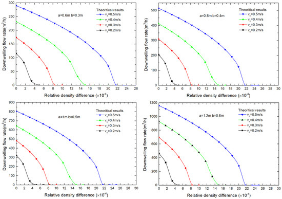 Variation of downwelling flow rate vs. relative density difference for different tube geometries under different horizontal current velocities. ( = 4 m).