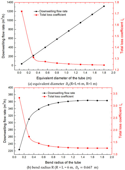 A bend radius that is too small causes a greater pressure drop at the bend. This increases the total loss coefficient and reduces the downwelling flow rate, which is unsatisfactory. As the bend radius changes from 0.1 to 1.9, the total loss coefficient increases by 61%, resulting in an increase of 62.5% in the downwelling flow rate. Similar to the way the tube diameter is determined, the bend radius of the tube should be reasonably large such that safety is guaranteed.