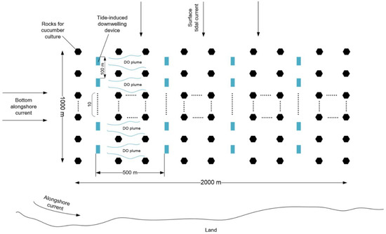 Figure 15 shows the schematic of deployment of downwelling devices in the Muping marine ranch. The engineering effect of these 40 downwelling devices is further shown in Table 4. It is feasible to alleviate hypoxia of Muping marine ranch by using the tide-induced downwelling device to drive downwelling flow. Noted that released from the pump outlet, the surface water immediately rises with its own buoyancy, entraining the ambient water. One would expect as much entrainment as it could be, otherwise, a great portion of dissolved oxygen comes back to the surface, which is unsatisfactory. The authors have published one paper on this issue and claim that the ratio between the total entrained flow rate and the source discharge depends on the ambient current speed, the relative density difference and the pump geometry [26]. For the scenario of Muping marine ranch, assuming a constant ratio between the pipe length immersed below the pycnocline and the pipe diameter, incident current speed is relatively small and indicative of a high entrainment ratio [26]. It is thus reasonable to argue that the dissolved oxygen is effectively delivered to the hypoxia bottom water.