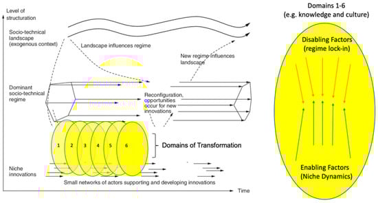 Within the sustainability transitions literature, the multi-level perspective (MLP) provides a useful heuristic framework. It has been used to conceptualize dynamics and patterns in socio-technical transitions as “non-linear processes that result from the interplay of developments at three analytical levels: niches (the locus for radical innovations and alternatives), dominant regimes (the locus of established practices and associated rules that stabilize existing systems), and an exogenous landscape” [17] (Figure 1). The MLP encourages a systems analysis that positions agroecology within a wider, overarching socio-technological framework. It provides a relatively simple yet powerful heuristic framework to conceptualize the complex multiple elements, levels, dimensions, and aspects of agroecology transformations that can be read across the growing number of studies on agroecology.