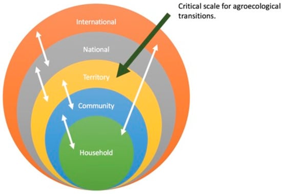Many aspects of what is now referred to as agroecology have been occurring for millennia in traditional and indigenous communities, and have been intentionally advanced more recently through grassroots organizing, science, legislation, policy, and programs. However, only in the last few years has there been a growing emphasis on how to scale-up agroecology to move beyond its marginal-but-widespread existence in the interstices of industrial farming, yet still retain its basis in community self-organization. Initially, there has been a strong focus on how to transition individual farms (e.g., [19]). Gliessman [20] proposed 5 different levels of transitions, which has been widely adopted. However, others have conceptualized the process of scaling agroecology as a rather messy and chaotic, but steady, process that sees agroecology grow from “islands of success” to greater territorial or national spread as well as receiving institutional recognition and support (e.g., [9,21]). These studies have drawn on case-study or multi-case study approaches to articulate different aspects, drivers, dimensions, and qualities that need to be in place in a particular territory in order for agroecology to be nurtured, to grow, to massify, to scale, and to become strengthened on-farm, across and between territories, and throughout the food system. Our study reviewed these different emerging perspectives to develop a framework for conceptualizing agroecology transformations.