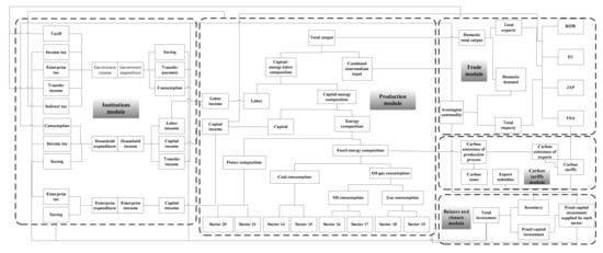 In order to fully study the long-term impacts of a carbon tariff, we construct a recursive DCGE model. The basic framework can be founded in Figure 1. There are 21 sectors, including 13 non-energy sectors (sector 1: Primary industry; sector 2: Mining industry; sector 3: Food manufacturing and tobacco processing industry; sector 4: Textile and products industry; sector 5: Wood-processing, paper, and printing industry; sector 6: Chemical industry; sector 7: Nonmetallic mineral production industry; sector 8: Metal smelting and production industry; sector 9: Machinery and equipment manufacturing; sector 10: Communications, instrumentation and other equipment manufacturing; sector 11: Construction; sector 12: Transportation, storage, and post; and sector 13: Other services) and eight energy sectors (sector 14: Coal mining and selection; sector 15: Coking industry; sector 16: Oil exploitation industry; sector 17: Oil and nuclear fuel processing industry; sector 18: Gas exploration industry; sector 19: Gas production and supply; sector 20: Thermal power; and sector 21: Clean energy). The basic consumptions and equations on the five modules of production, institutions, balance and closure, dynamics and welfare can be found in Xu et al. [48]. As a modification and extension, the other two modules—trade and carbon tariffs—are specifically introduced as follows.